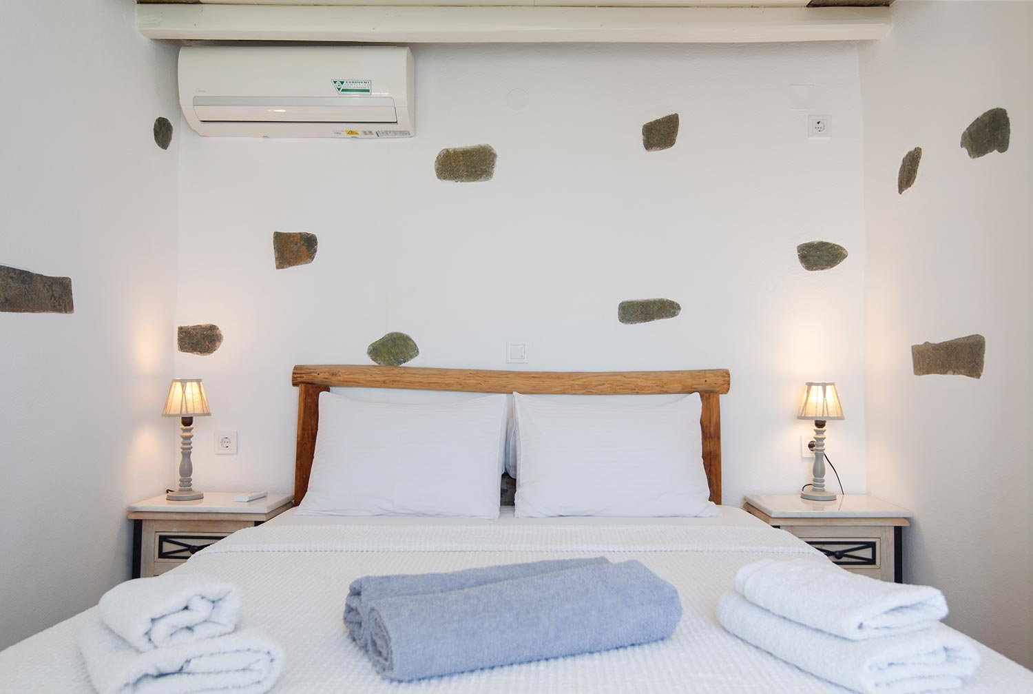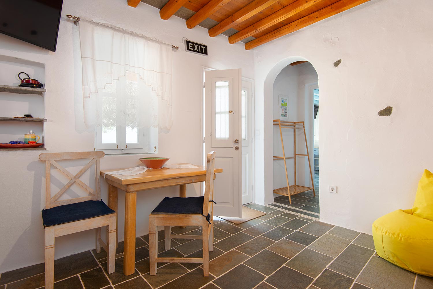 Το Efthymia apartments διαθέτει δύο διαμερίσματα 40τμ το καθένα με τις ονομασίες "Βουκαμβίλια" και "Στροφή". Πρόκειται για δύο όμοια καταλύματα, τα οποία διαθέτουν κυρίως υπνοδωμάτιο με διπλό κτιστό κρεβάτι και ένα ακόμη δωμάτιο στο οποίο βρίσκεται η κουζίνα και το καθιστικό. Στο καθιστικό υπάρχει καναπές που μπορεί να γίνει κρεβάτι (μονό ή διπλό). Στο εσωτερικό των διαμερισμάτων, το ξύλο εναλάσσεται με την πέτρα, οι χρωματισμοί είναι γήινοι και τα κυκλαδίτικα στοιχεία ολοκληρώνουν την εικόνα.