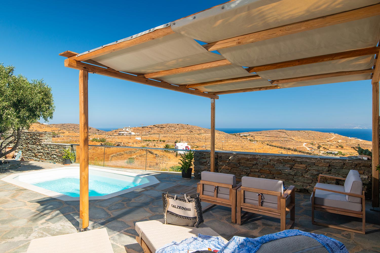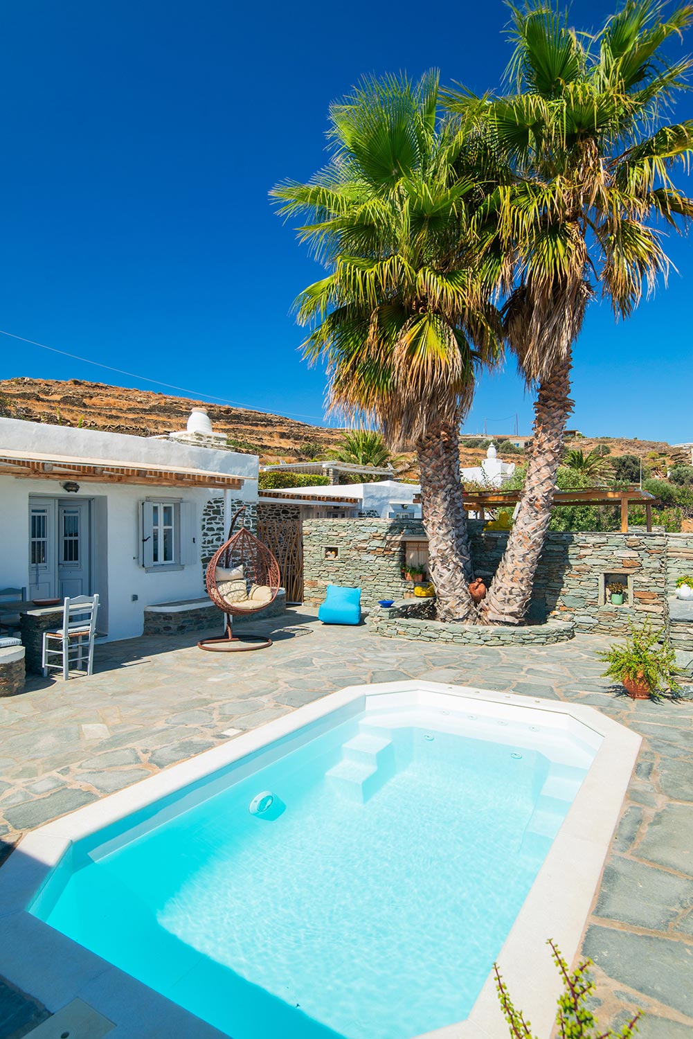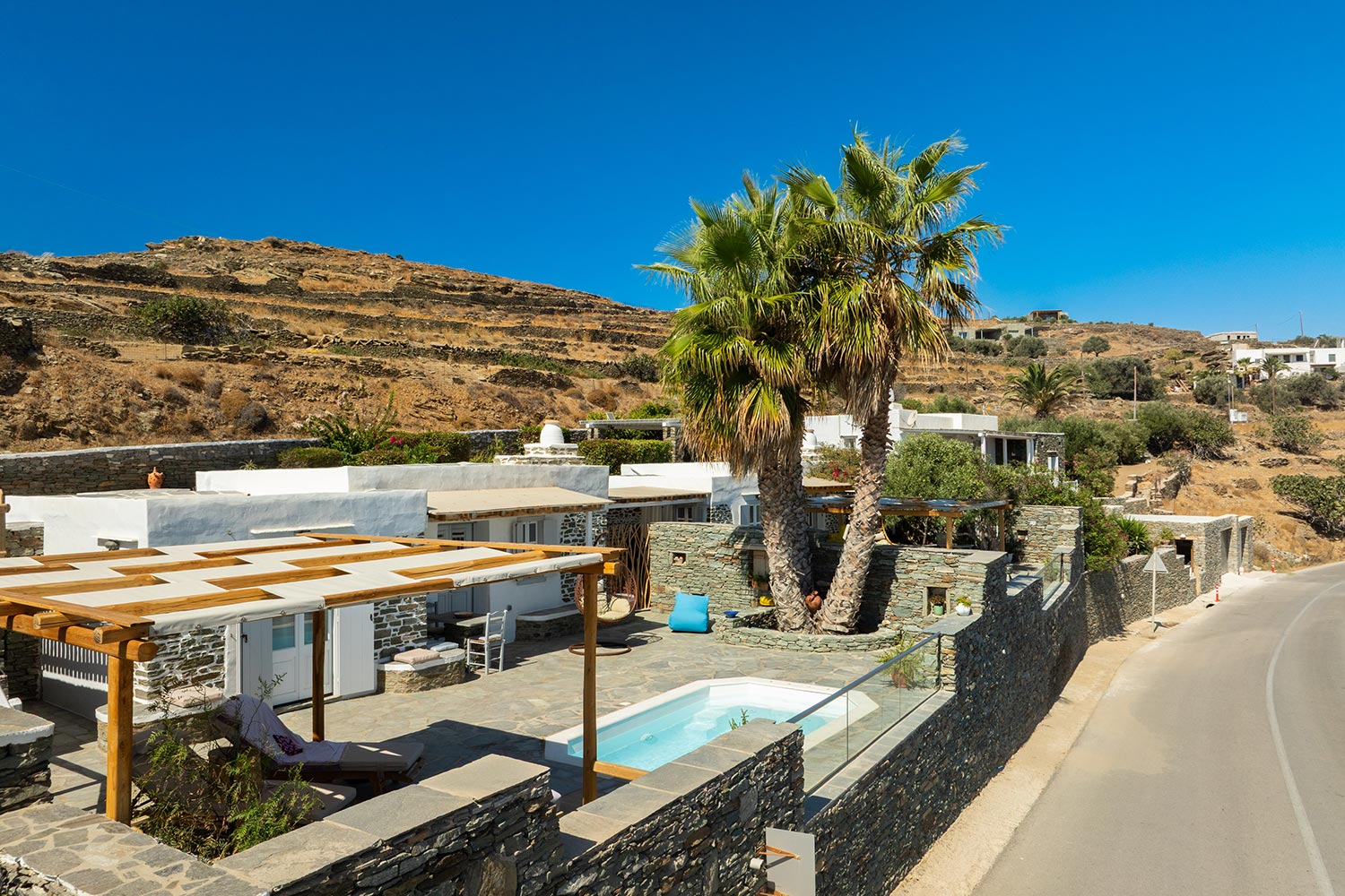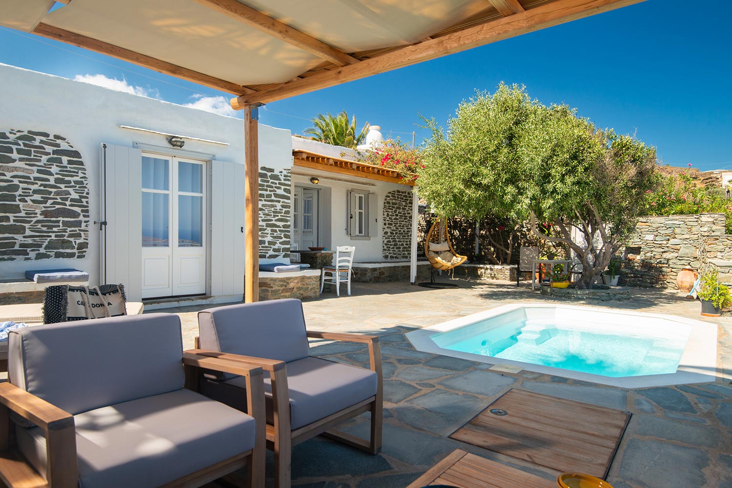 Μια υπέροχη ευρύχωρη αυλή με μικρό καθιστικό και ιδιωτική πισίνα βρίσκεται μπροστά από κάθε διαμέρισμα, διαχωρισμένη από το διπλανό ώστε να εξασφαλίζεται η ιδιωτικότητα των φιλοξενούμενων. Η θέα είναι πραγματικά υπέροχη καθώς μπροστά απλώνεται η περιοχή του Φάρου με τις ξερολιθιές και τα ελαιόδεντρα και το καταγάλανο Αιγαίο.