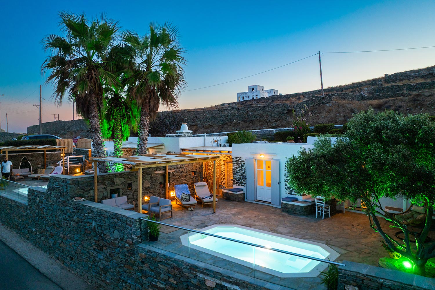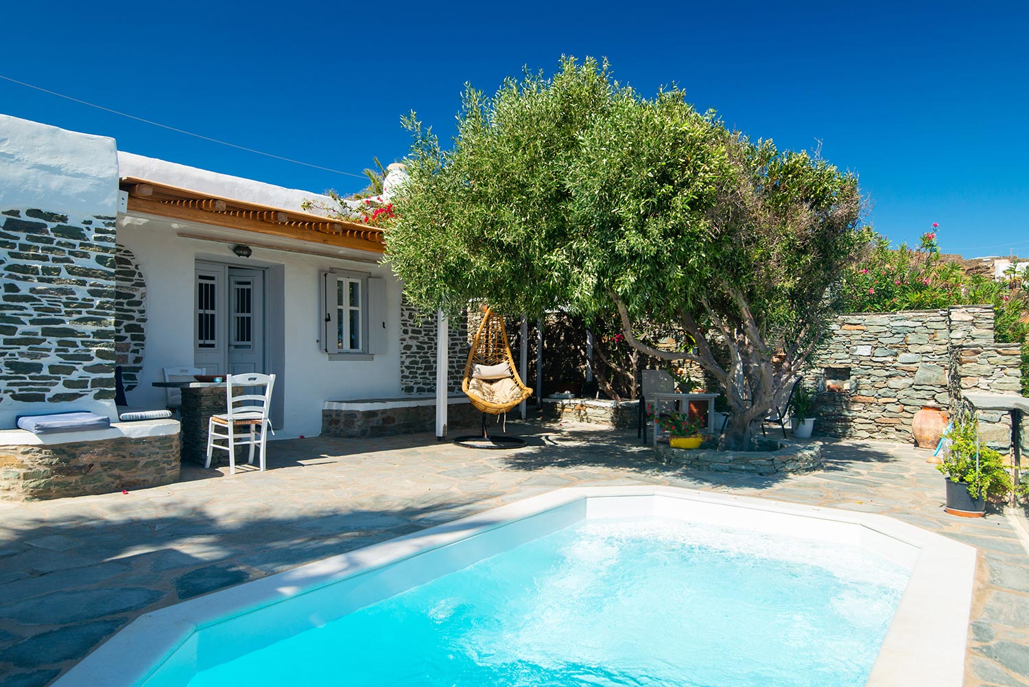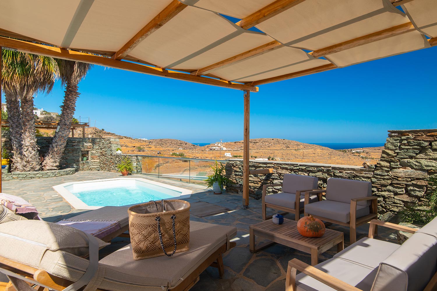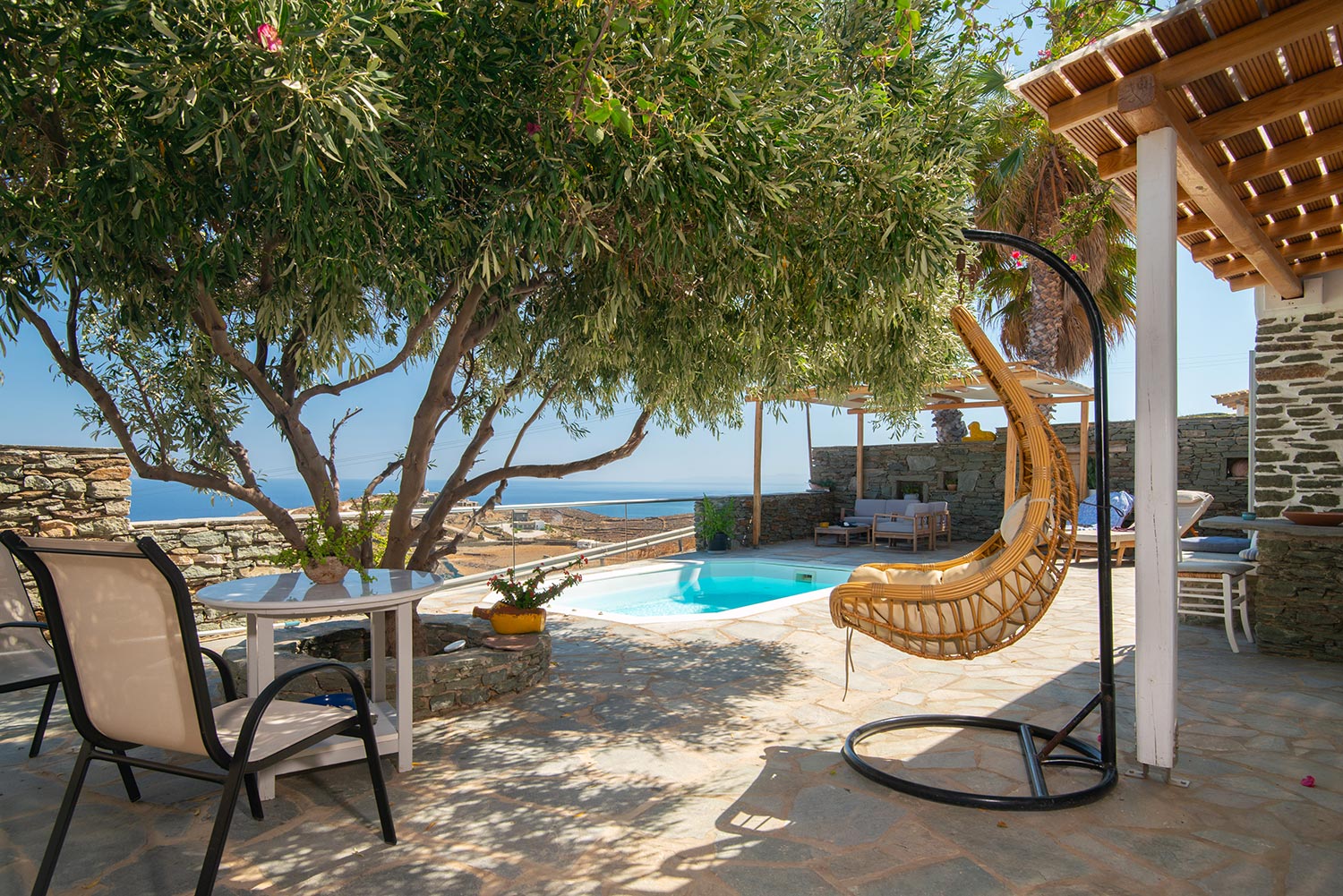 Μια υπέροχη ευρύχωρη αυλή με μικρό καθιστικό και ιδιωτική πισίνα βρίσκεται μπροστά από κάθε διαμέρισμα, διαχωρισμένη από το διπλανό ώστε να εξασφαλίζεται η ιδιωτικότητα των φιλοξενούμενων. Η θέα είναι πραγματικά υπέροχη καθώς μπροστά απλώνεται η περιοχή του Φάρου με τις ξερολιθιές και τα ελαιόδεντρα και το καταγάλανο Αιγαίο.