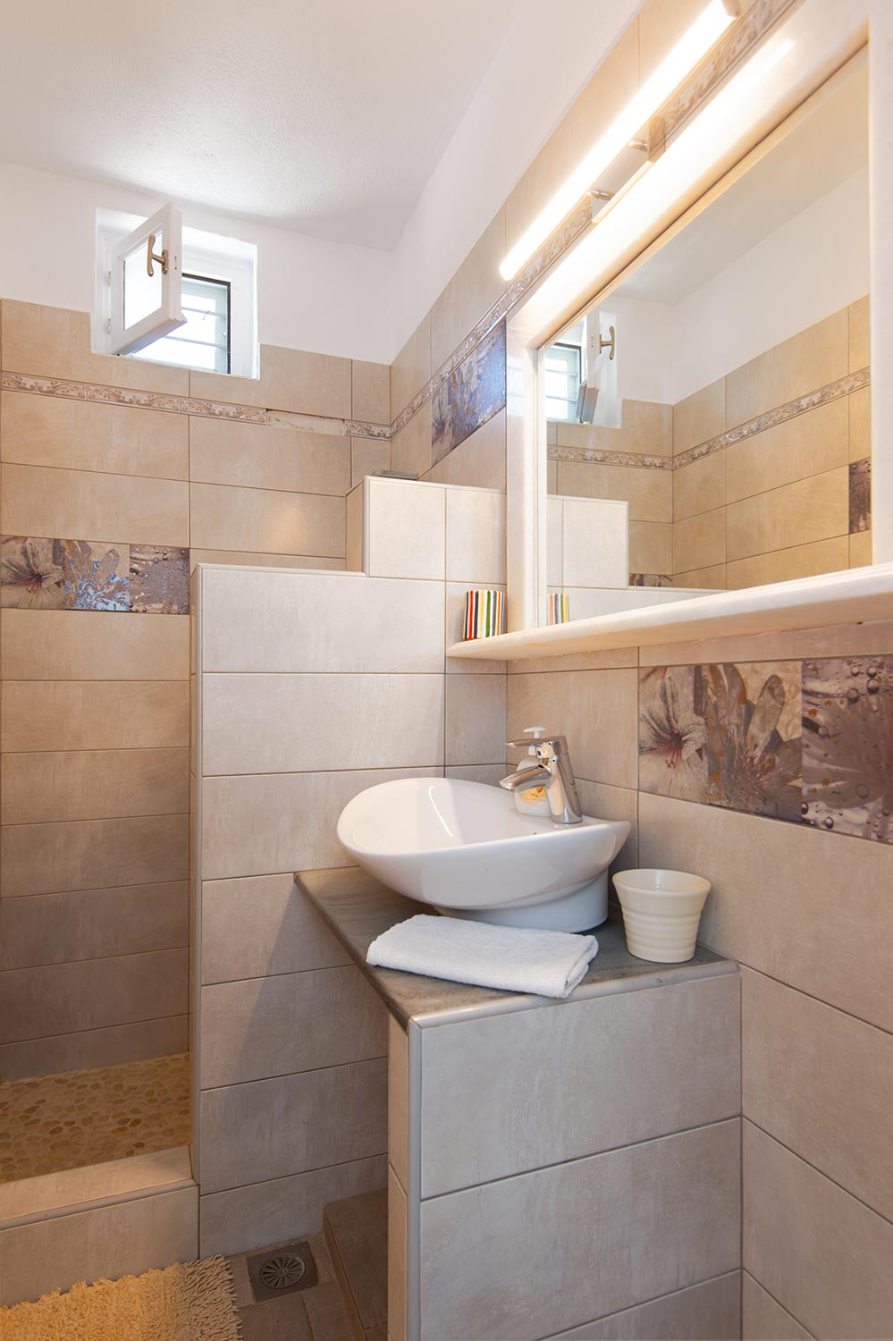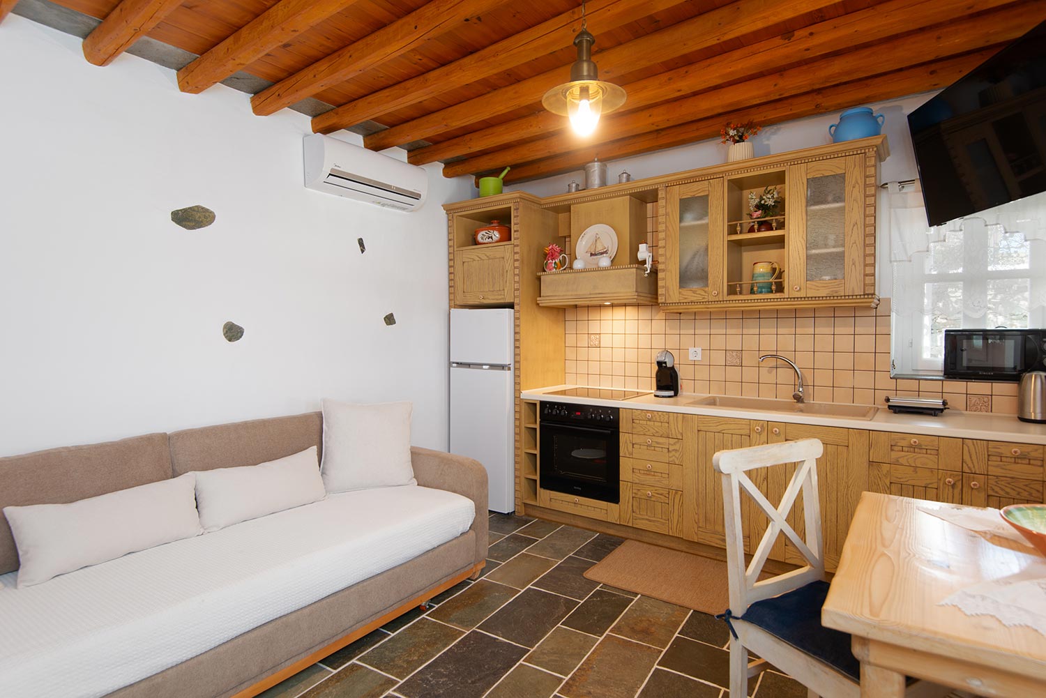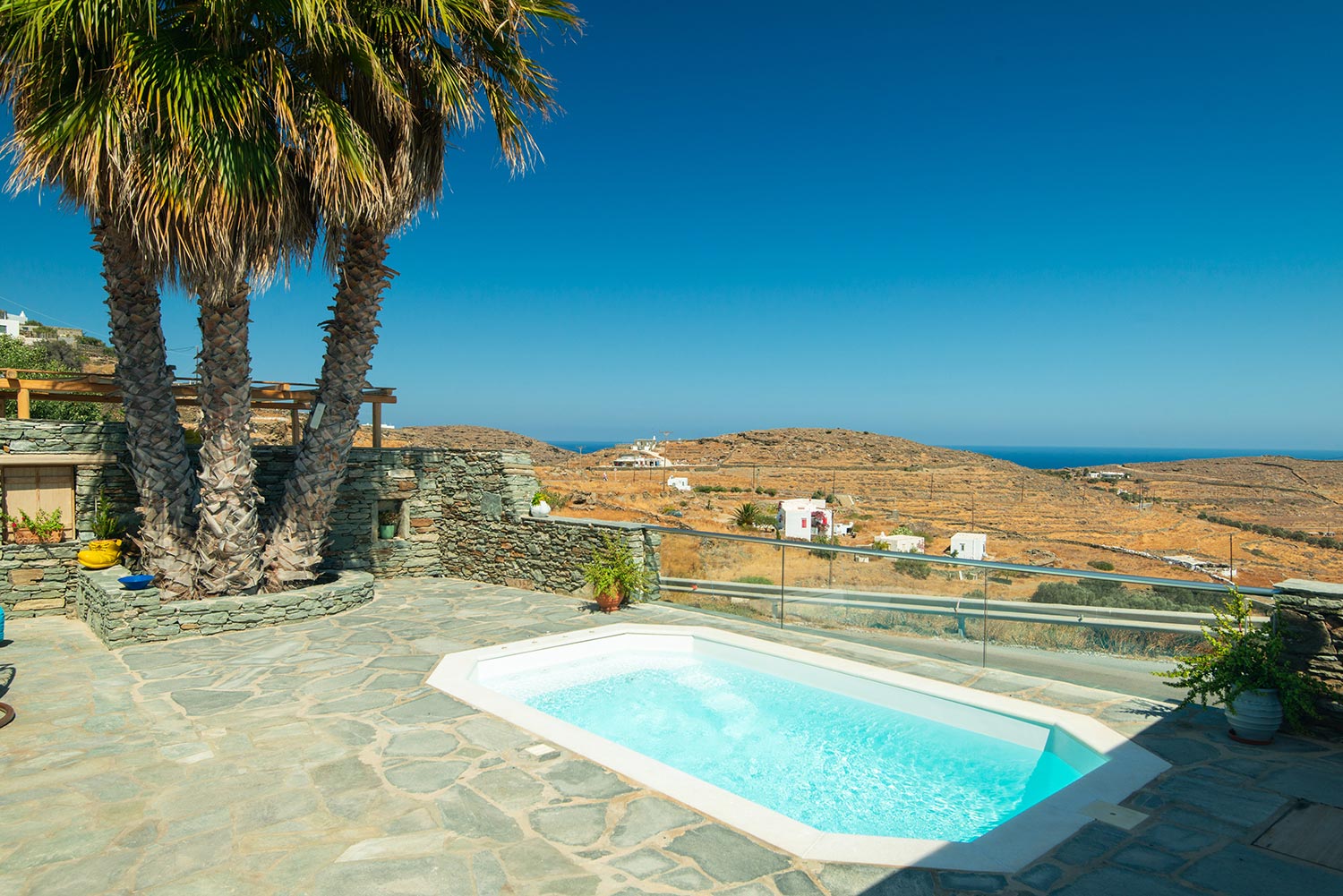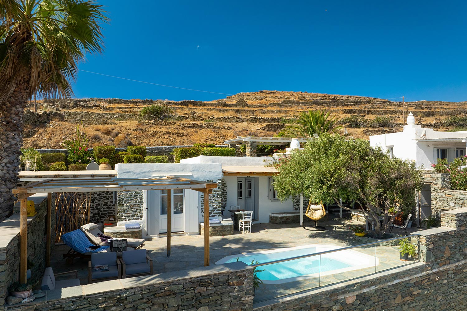 Μια υπέροχη ευρύχωρη αυλή με μικρό καθιστικό και ιδιωτική πισίνα βρίσκεται μπροστά από κάθε διαμέρισμα, διαχωρισμένη από το διπλανό ώστε να εξασφαλίζεται η ιδιωτικότητα των φιλοξενούμενων. Η θέα είναι πραγματικά υπέροχη καθώς μπροστά απλώνεται η περιοχή του Φάρου με τις ξερολιθιές και τα ελαιόδεντρα και το καταγάλανο Αιγαίο.